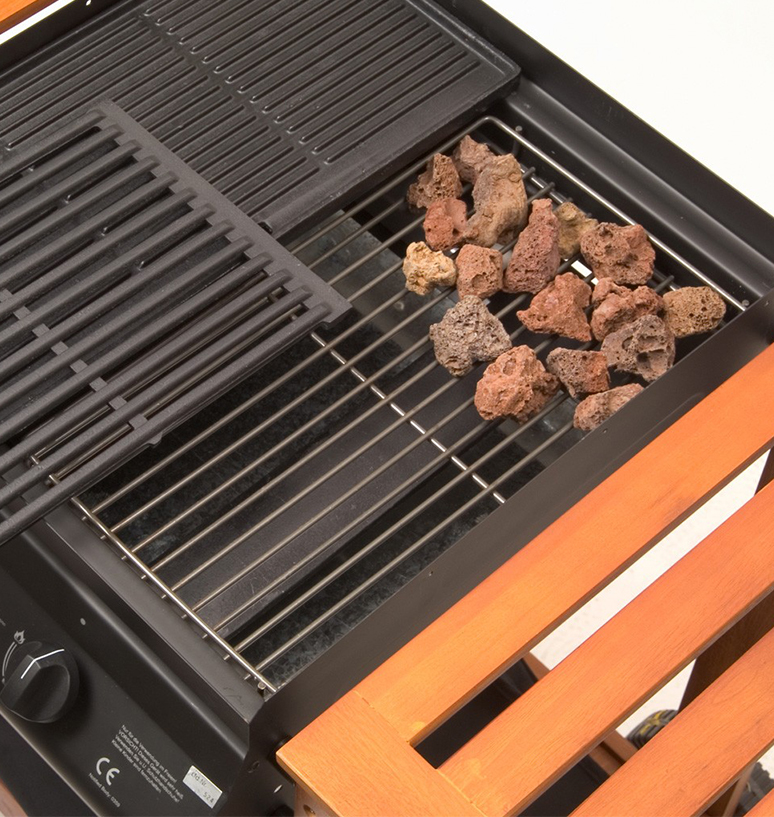 Лавовый гриль Illinois Lava Stone оснащен двумя горелками Endotube мощностью 2х3,5 кВт и встроенным в регуляторы подачи газа пьезорозжигом. Рабочая поверхность гриля (45х41 см) разделена на две разные зоны с решеткой и плитой для контактного и бесконтактного приготовления, которые изготовлены из эмалированного чугуна. Высота гриля – 81 см, что делает его удобным для использования. Изящный и экологичный корпус гриля изготовлен из качественной специально обработанной древесины, устойчивой к атмосферным и механическим воздействиям.