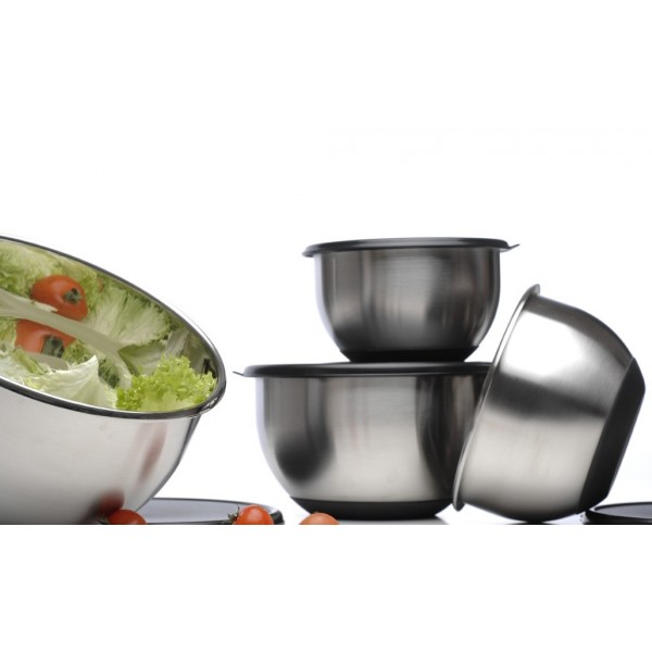 Из нержавеющей стали 18/10 Полированная поверхность обладает защитными свойствами, гигиенична, ее легко чистить Нескользящее основание за счет резиновых накладок В подарочной упаковке миски диаметром 16 см вместимостью 1,4 л; диаметром 18 см вместимостью 1,8 л; диаметром 20 см вместимостью 2,7 л; диаметром 24 см вместимостью 4,1 л