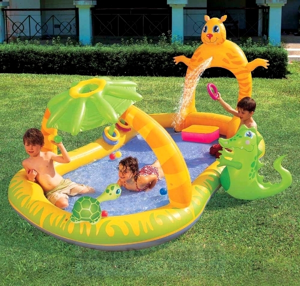 Bestway 53030 Надувной игровой центр. Этот детский центр Джунгли похож на настоящий сказочный водный зоопарк посреди собственного двора. Дети будут в восторге от игры в Bestway 53030. Батут-центр украсит любой уголок двора, загородного дома. В комплект Bestway 53030 входят и две надувные игрушки: черепаха и крокодил. Есть небольшая надувная горка, симпатичный тент, защищающий от лучей солнца. Можно подключить шланг и сделать фонтанчик. В комплекте имеется ремкомплект.