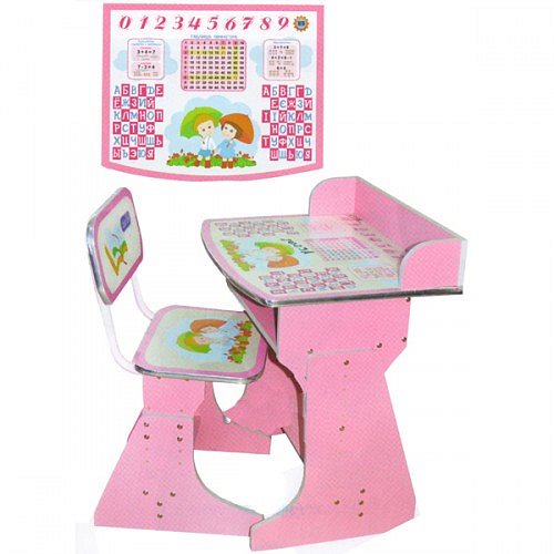 - На столешнице парты изображены украинский алфавит, цифры и карта страны, которые помогут ребенку в обучении, имеется бортик, предотвращающий падение канцелярских принадлежностей.