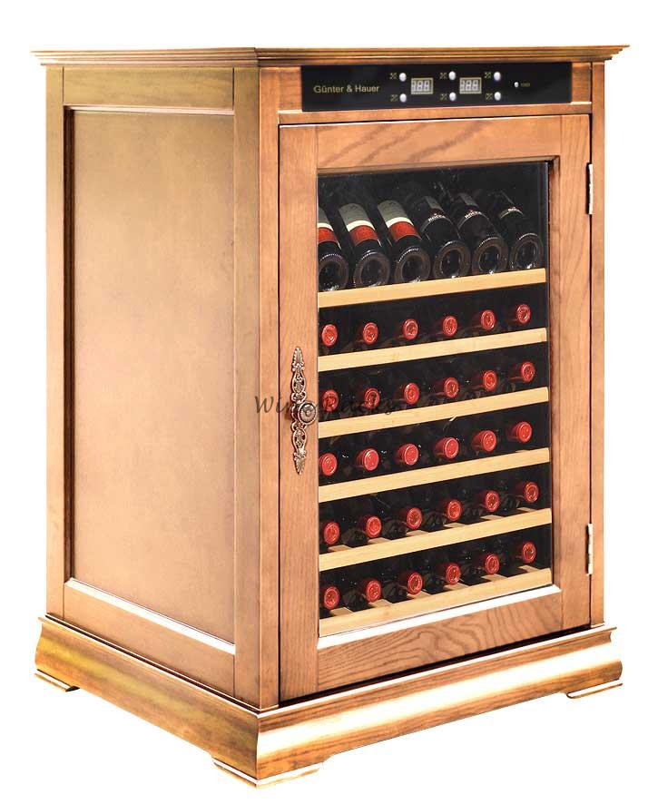 Винный шкаф Gunter&Hauer WK 138 A C1 - 48 бут., корпус американский дуб. Винный шкаф Gunter&Hauer WK 138 A C1 имеет контроль температуры компьютер, рег.темп. 5-22С. Винный шкаф Гюнтер и Хауэр WK 138 A C1 это также стекло с защитой от ультрафиолетовых лучей, антивибрационная система компрессора, 5полок, (ВхШхГ,см) 103х72х62,эл. кВт/ч в сутки 0,8,цвет махагон