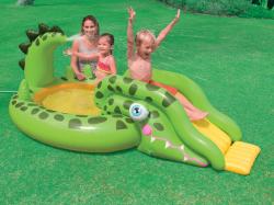 Intex 57132 Надувной игровой центр. Игровой- центр "Крокодил". Бассейн может вместить нескольких детей. Рекомендуется данный бассейн для деток от 3 лет. Подсоединив садовый шланг, Вы получите целый оазис и миллионом брызг. Игровой центр Intex 57132 станет прекрасным развелечением для компании дтей. Широкие и мягкие бортики специально приспособлены для того, чтобы дети могли легко перелазить через них, сидели, прыгали и катались на горке. Игра на свежем воздухе с водой это весело.