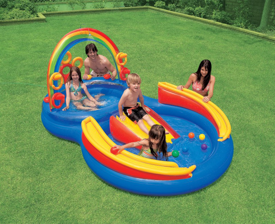 Из маленького бассейна в большой можно спуститься по надувной горке. Из достоинств этого игрового центра Intex 57453 можно отметить яркую надувную радугу, возвышающуюся на бассейном. К радуге можно подключить садовый шланг, и тогда фонтанчик создаст комфорт и прохладу даже в самый жаркий день.
