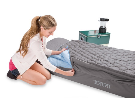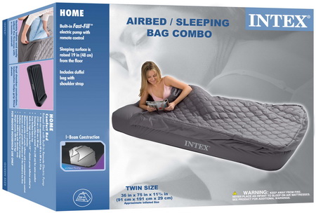 Intex 66998 Кровать расчитана на одного человека. Тёплый спальный мешок и удобный надувной матрац могут использоваться вместе или отдельно (соединение на молнии). В комплект входит сумка с ручкой. Допустимая нагрузка на изделие в надутом состоянии 136 кг.