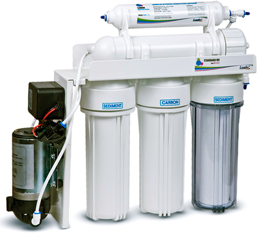 Система обратного осмоса Leader RO-5 с помпой- 5-тиступенчатый фильтр обратного осмоса состоящий из трех ступеней предварительной очистки, мембраны обратного осмоса и линейного угольного пост-фильтра.